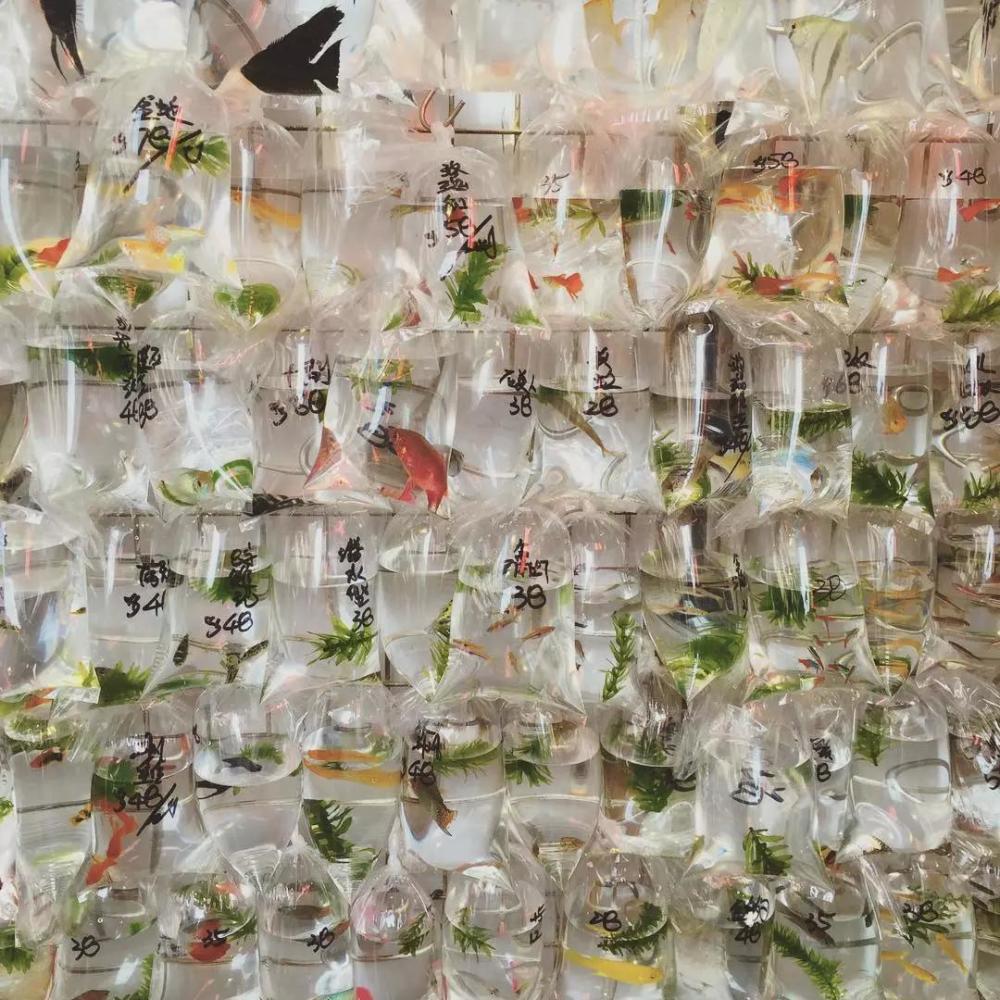 一个个透明塑料袋就是金鱼的全世界,站在“金鱼墙”旁,看着灵活游动的小鱼,真想上带它们回家( )